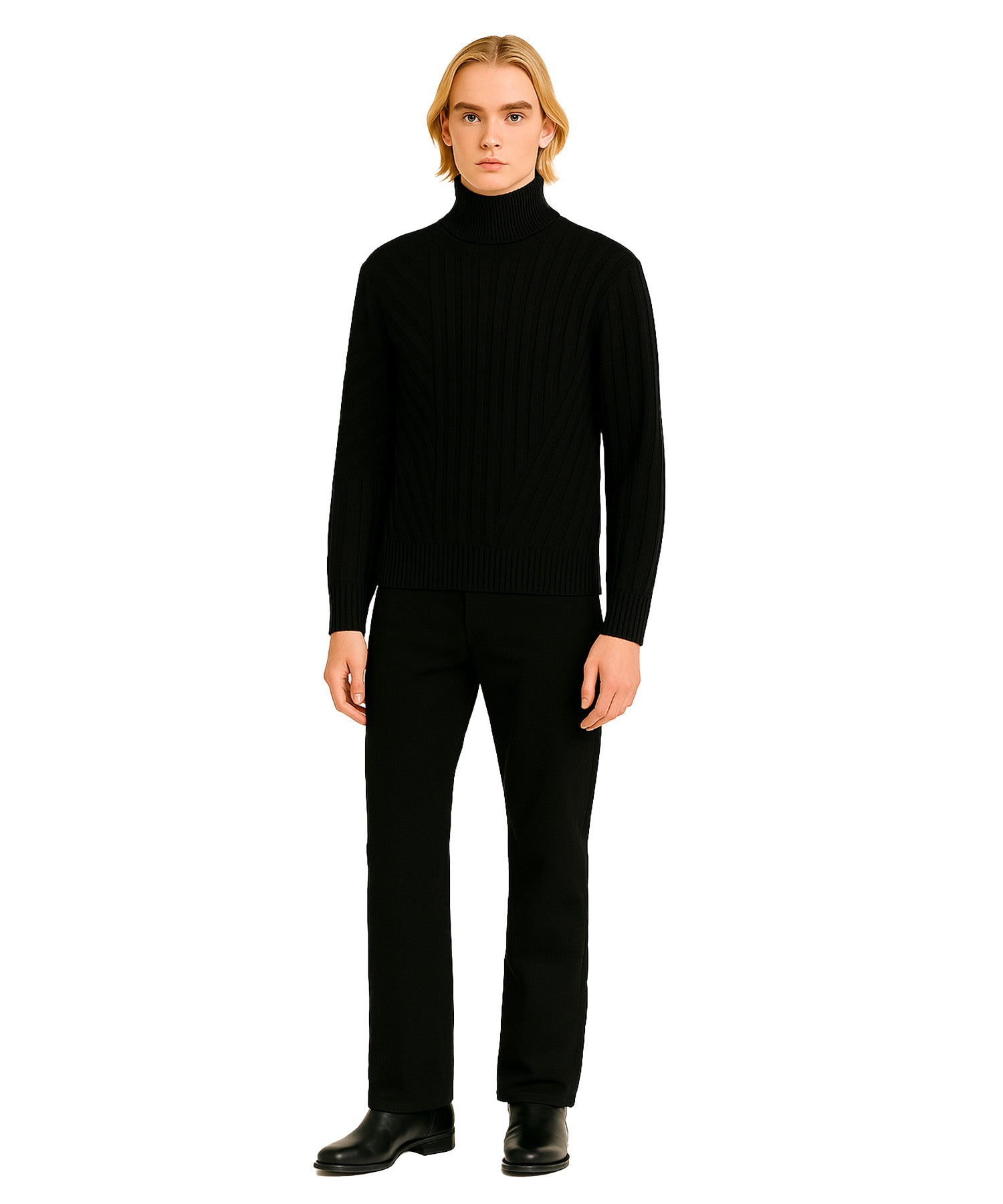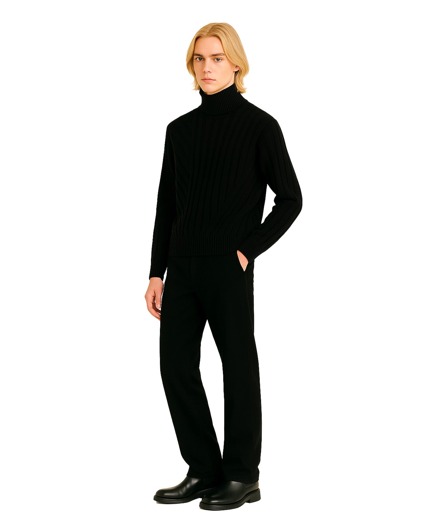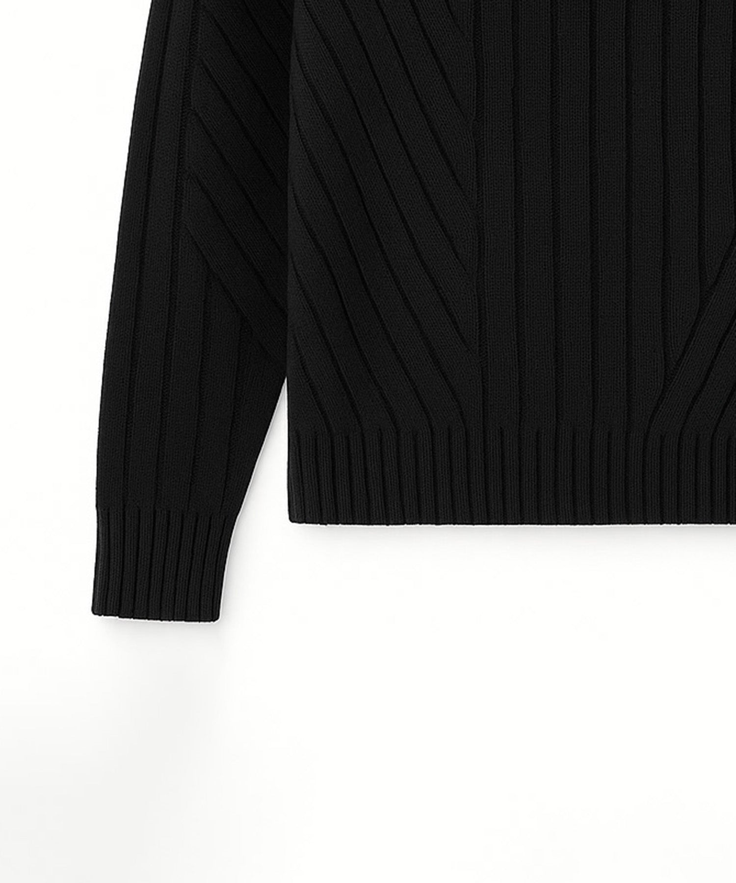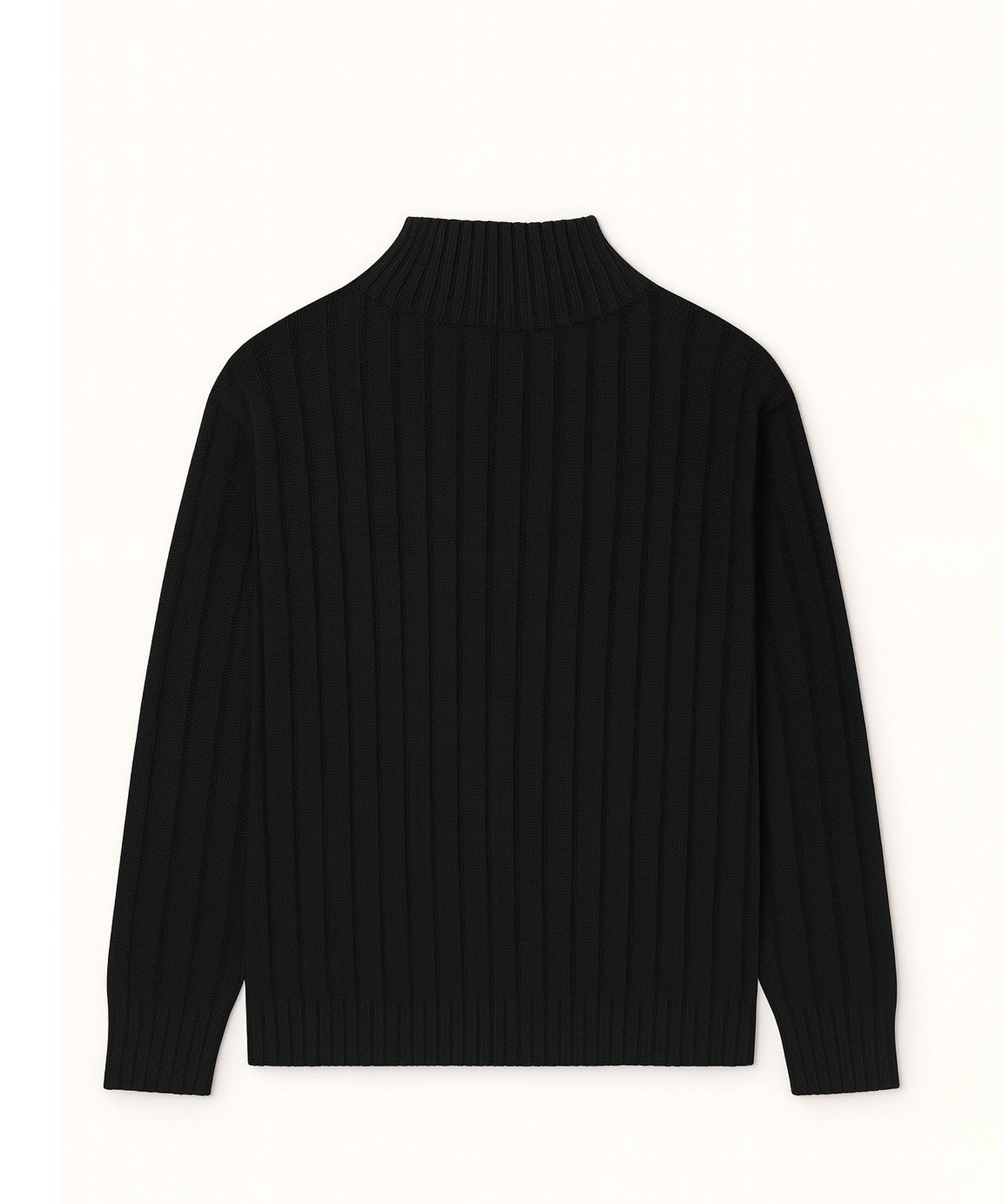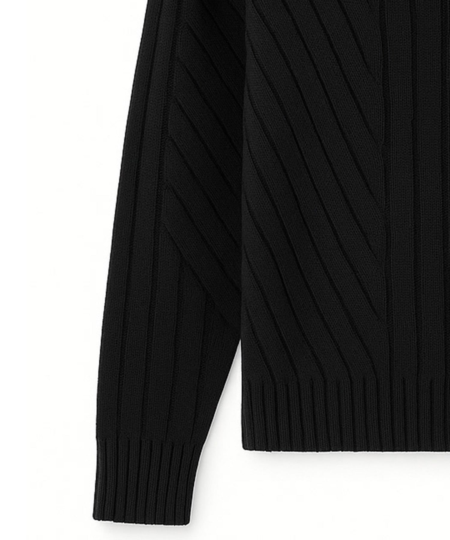 ミドルゲージアゼ変形編みのハイネックニット。
